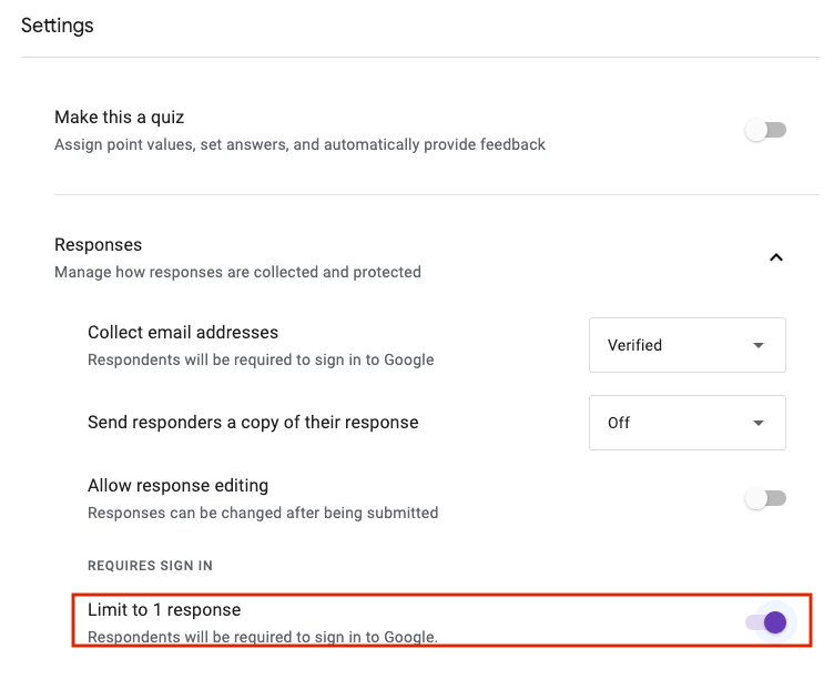 - Select “Responses” Settings: In the settings menu, go to the “Responses” section and enable the “Limit to 1 response” option.