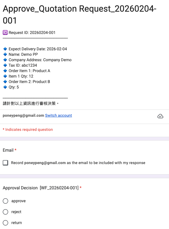 - Approval requests are handled directly within Google Forms—no platform switching required